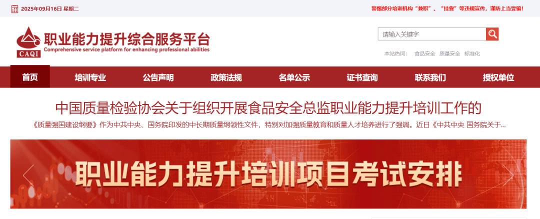 食物出产、加工企业中的高级办理人员和食物平安工做次要担任人,餐饮企业的高级办理人员和食物平安工做次要担任人,企事业单元中食物平安工做次要担任人和分担带领,畅通范畴相关企业的食物平安工做次要担任人,相关从管部分的食物平安监管人员,有志于处置食物平安办理工做的相关专业手艺人员等。培训完成报名且获得授权的进修账号后,可按照本身需要随时登录上述线上培训办事平台进行正在线年第四时度起头,拟正在每个季度的最初一个周六或周日进行培训测验(具体放置以本协会网坐发布通知为准);培训完成对应课程所需需要学时的进修后,按照相关要乞降相关登录上述线上培训办事平台正在时间内进行同一测验。第一步:正在旅逛器输入进入 中国质量查验协会官网,或者百度搜刮“中国质量检 验协会”进入官网。第二步:官网页面下滑点击“职业 能力提拔培训栏目” ,进 入职业能力提拔分析办事平台。第三步:进入《职业能力提拔分析 办事平台》点击进修中 心,进入登录页面输入账 号及暗码,点击登录。中国质量查验协会是由质量查验行业取质量范畴的质量查验手艺机构和专家学者、相关科研院所、大专院校、学术机构、企事业单元及质量工做取得显著成效的企业取企业担任人,取质量查验相关工做的社会相关人士等志愿结成的、行业性、具有法人资历。中国质量查验协会筹备于1986年,并于1992年正式成立,登记办理机关为平易近政部,行业次要办理部分为国度市场监视办理总局(简称国度市场监管总局),外行业次要办理部分的对口司局为国度市场监管总局质量成长局(牵头对口司局)、国度市场监管总局承认检测司。国度市场监管总局2018年4月组建成立之前,中国质量查验协会历任营业从管部分为原国度质量监视查验检疫总局(简称原国度质检总局)、原国度质量手艺监视局、原国度手艺监视局、原国度经济委员会质量局。