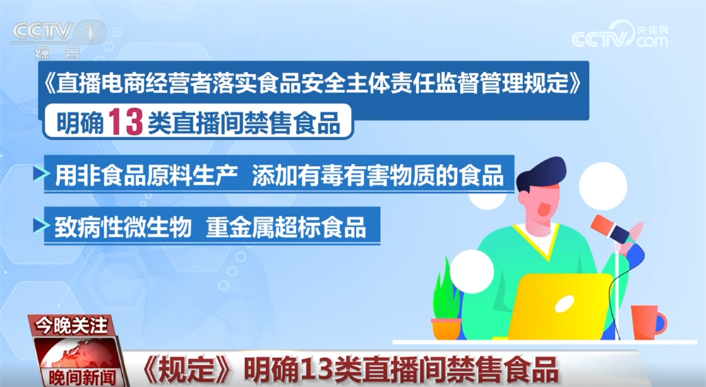 《》明白13类曲播间禁售食物,包罗用非食物原料出产、添加有毒无害物质的食物;致病性微生物、变质、霉变生虫食物;病死毒死或检疫不及格的畜禽水产肉类及其成品等,为曲播间食物规定“红线”。