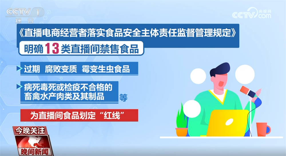 《》明白13类曲播间禁售食物,包罗用非食物原料出产、添加有毒无害物质的食物;致病性微生物、变质、霉变生虫食物;病死毒死或检疫不及格的畜禽水产肉类及其成品等,为曲播间食物规定“红线”。